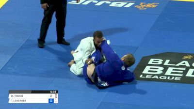 From collar and sleeve guard, Langaker attempted a triangle in this match against Marcos Tinoco. The initial threat of the triangle enticed Tinoco to keep his posture high, making room for Langaker’s K-hook. As Tinoco remained upright, Langaker scooped the far leg and inverted, swinging his leg behind and then swiveling his hips underneath to complete the matrix backtake.